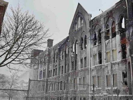 What remains of the former school building after a four alarm fire the night of January 15-16, 2026.